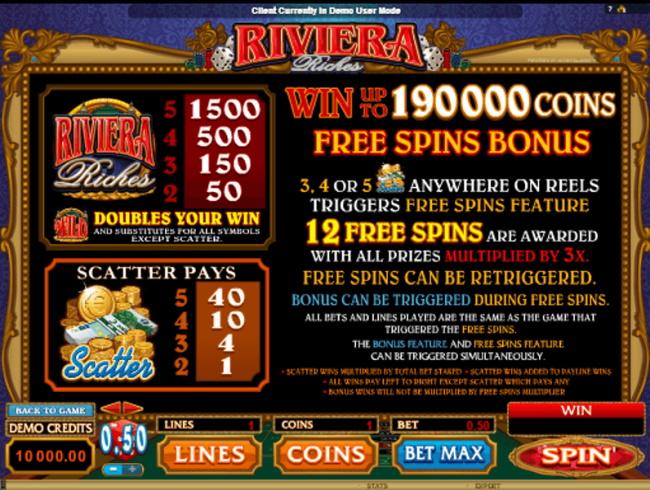 There is also the Riviera Riches icon, 5 of which will multiply line bets by 1,500. This is also a wild symbol that will replace other game icons to fill in winning sequences while also doubling the win amount. The only symbols that this symbol does not substitute for are the scatter symbols, one depicted by a nice big pile of cash and the other by a bonus roulette icon.